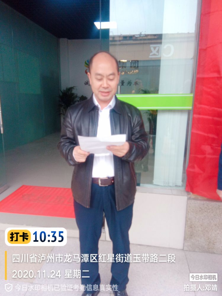 揭牌儀式前,項(xiàng)目經(jīng)理張明強(qiáng)致辭,回顧了從7月份開(kāi)始接管后的重大事件,感謝所有員工的辛勞付出,他表示在今后的工作中,我們要更加努力,認(rèn)真工作,服從區(qū)委區(qū)政府、業(yè)主單位各級(jí)領(lǐng)導(dǎo)的調(diào)配,熟練掌握操作技巧,提高安全意識(shí),把我們龍馬潭區(qū)的環(huán)衛(wèi)管理工作做得更好,用認(rèn)真工作的態(tài)度,用我們的實(shí)際行動(dòng),為營(yíng)造優(yōu)美、整潔、和諧的龍馬潭區(qū)城區(qū)環(huán)境而努力,提升城市品位。為公司在四川的發(fā)展奠定堅(jiān)實(shí)的基礎(chǔ)。