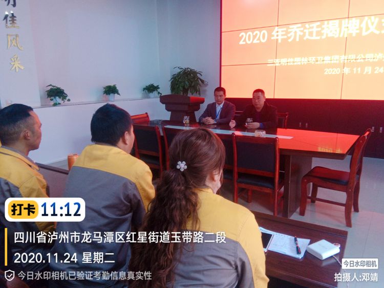 2020年11月24日,明佳集團(tuán)瀘州分公司新辦公室喬遷儀式隆重舉行。人大主任詹萬(wàn)勇,區(qū)綜合行政執(zhí)法局環(huán)衛(wèi)股股長(zhǎng)趙耿、重慶中仁公司昌總等領(lǐng)導(dǎo)來(lái)到明佳集團(tuán)瀘州分公司新辦公場(chǎng)地,為煥然一新的辦公樓正式啟用進(jìn)行喬遷揭牌。集團(tuán)公司生產(chǎn)質(zhì)安部副經(jīng)理鞠彬、集團(tuán)公司生產(chǎn)質(zhì)安部副經(jīng)理段永強(qiáng)、綜合辦公室、財(cái)務(wù)部、各部門(mén)管理人員共同見(jiàn)證這一歡慶時(shí)刻。