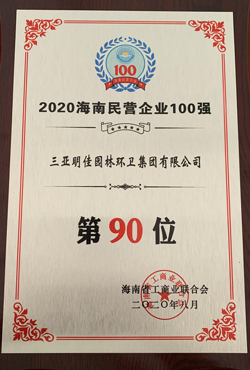 8月28日,“2020海南民營企業(yè)百強(qiáng)發(fā)布會”在??谂e行。三亞明佳園林環(huán)衛(wèi)集團(tuán)有限公司再次入選“海南民營企業(yè)100強(qiáng)”榜單,名列第90位。